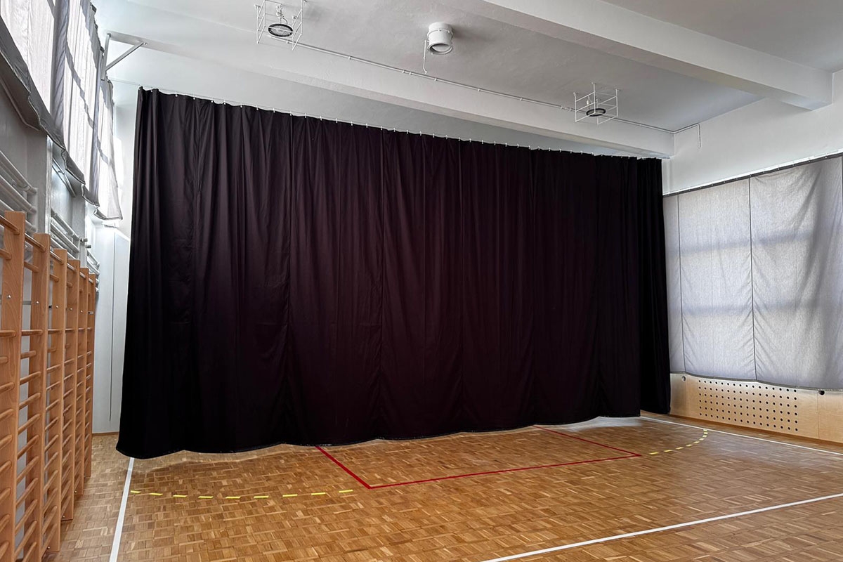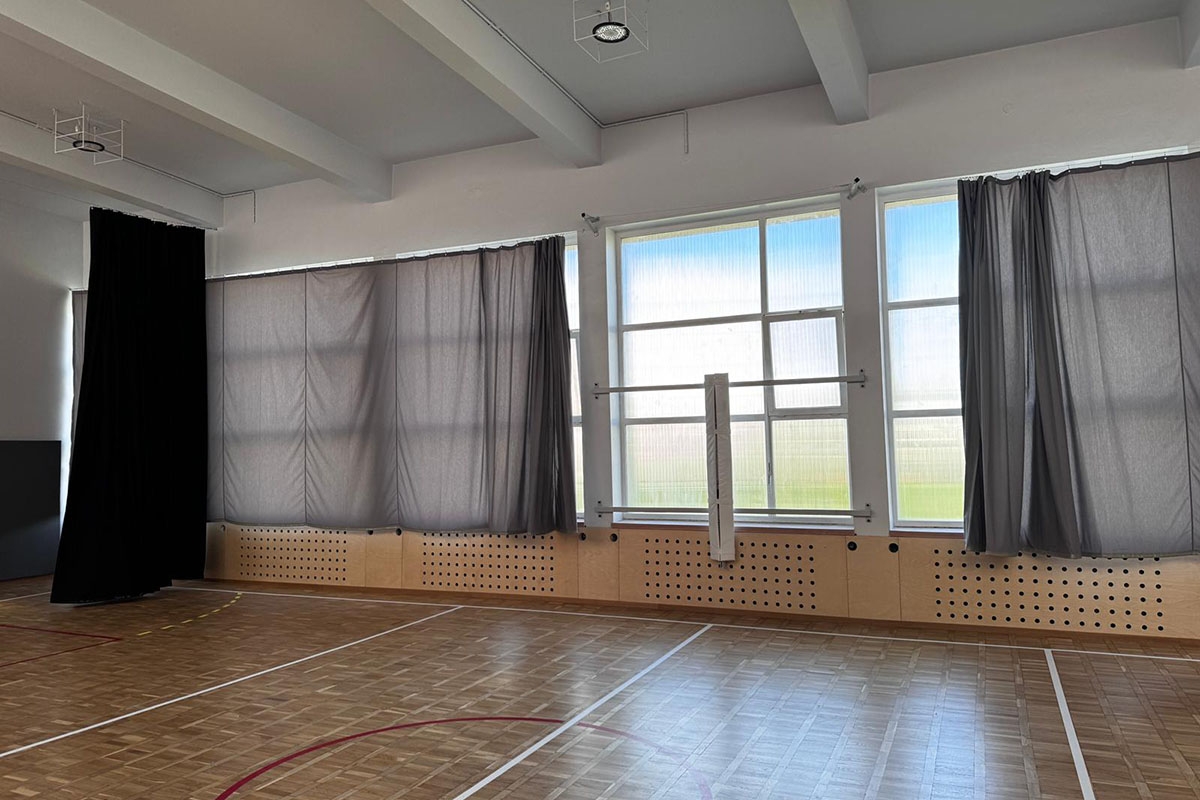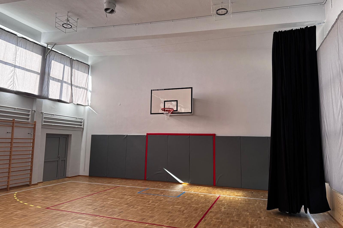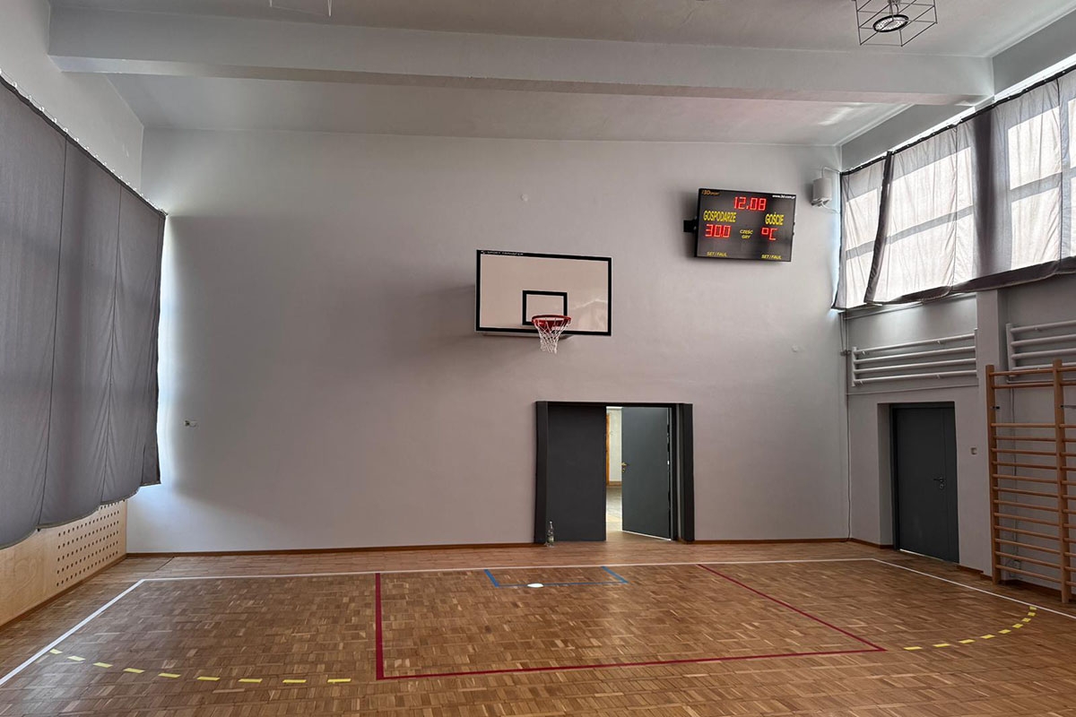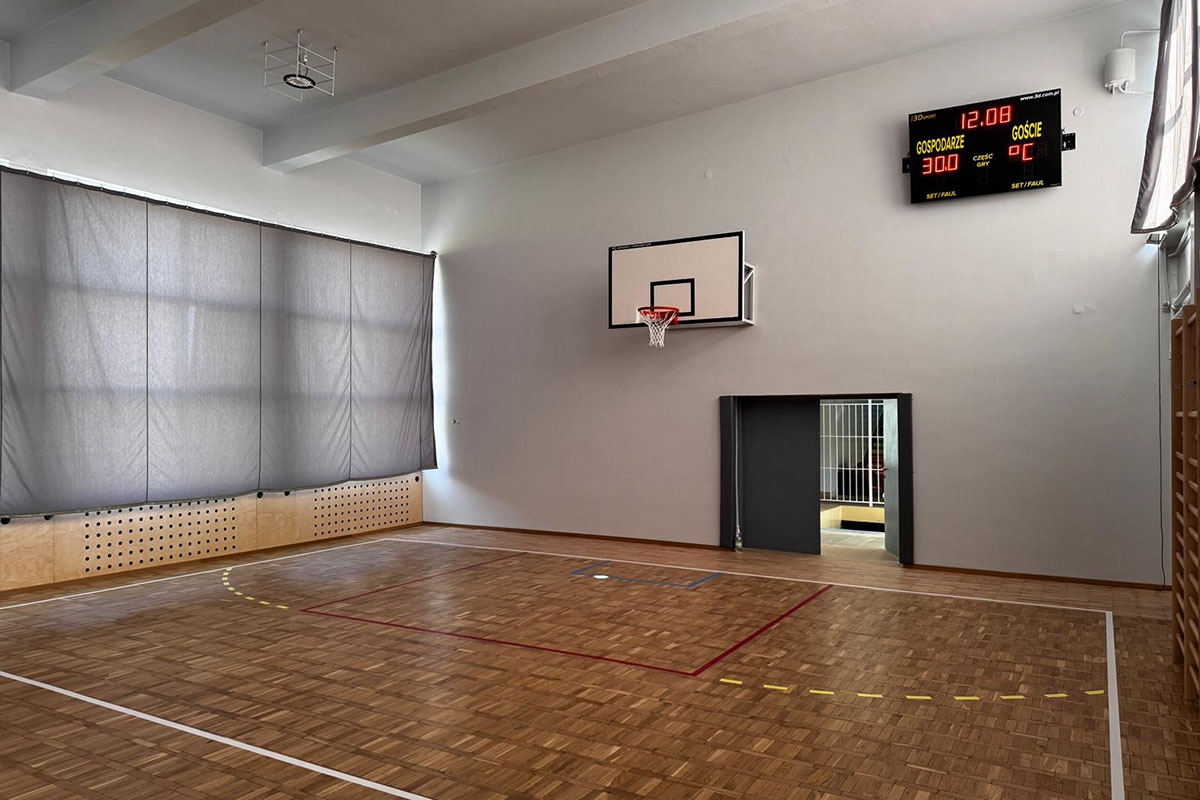 Realizacja obejmowała wyposażenie sali sportowej w konstrukcje do koszykówki, szyny ścienne do siatkówki, drabinki gimnastyczne, tablicę wyników sportowych, kotary zaciemniające salę, kotarę dzielącą salę oraz osłony na ściany sali sportowej.
