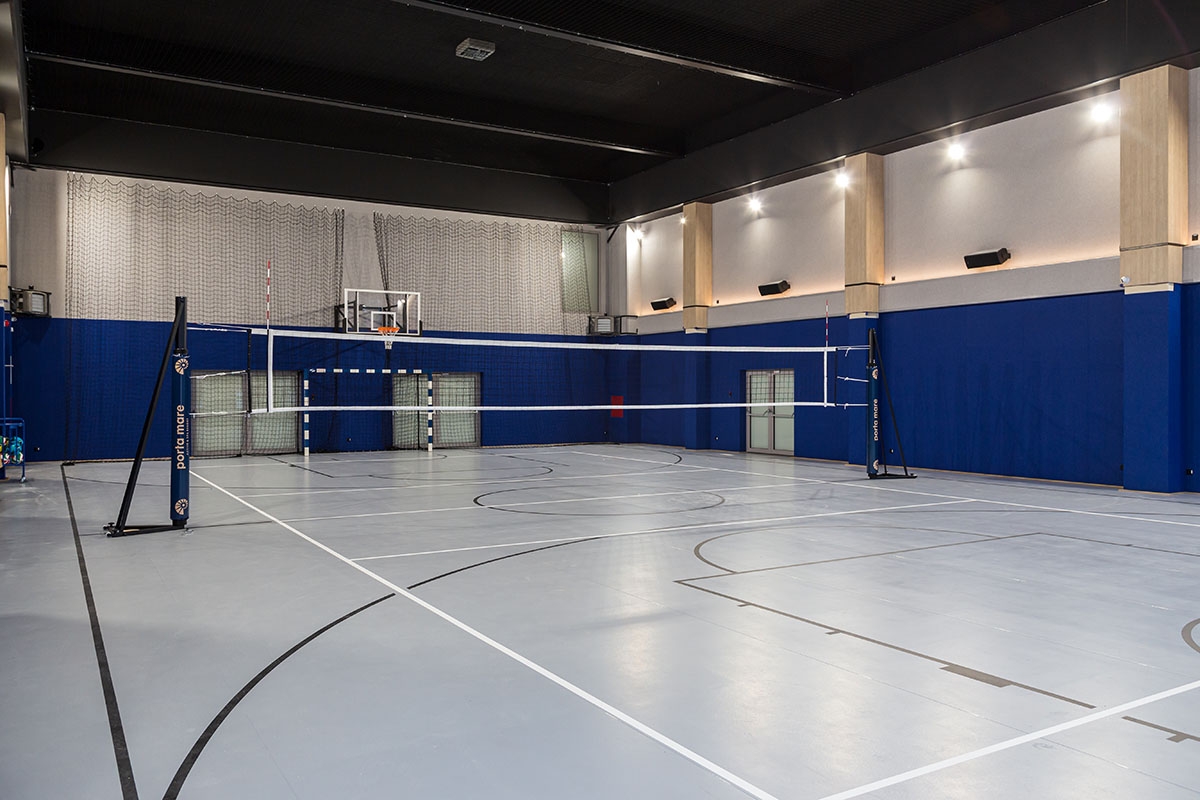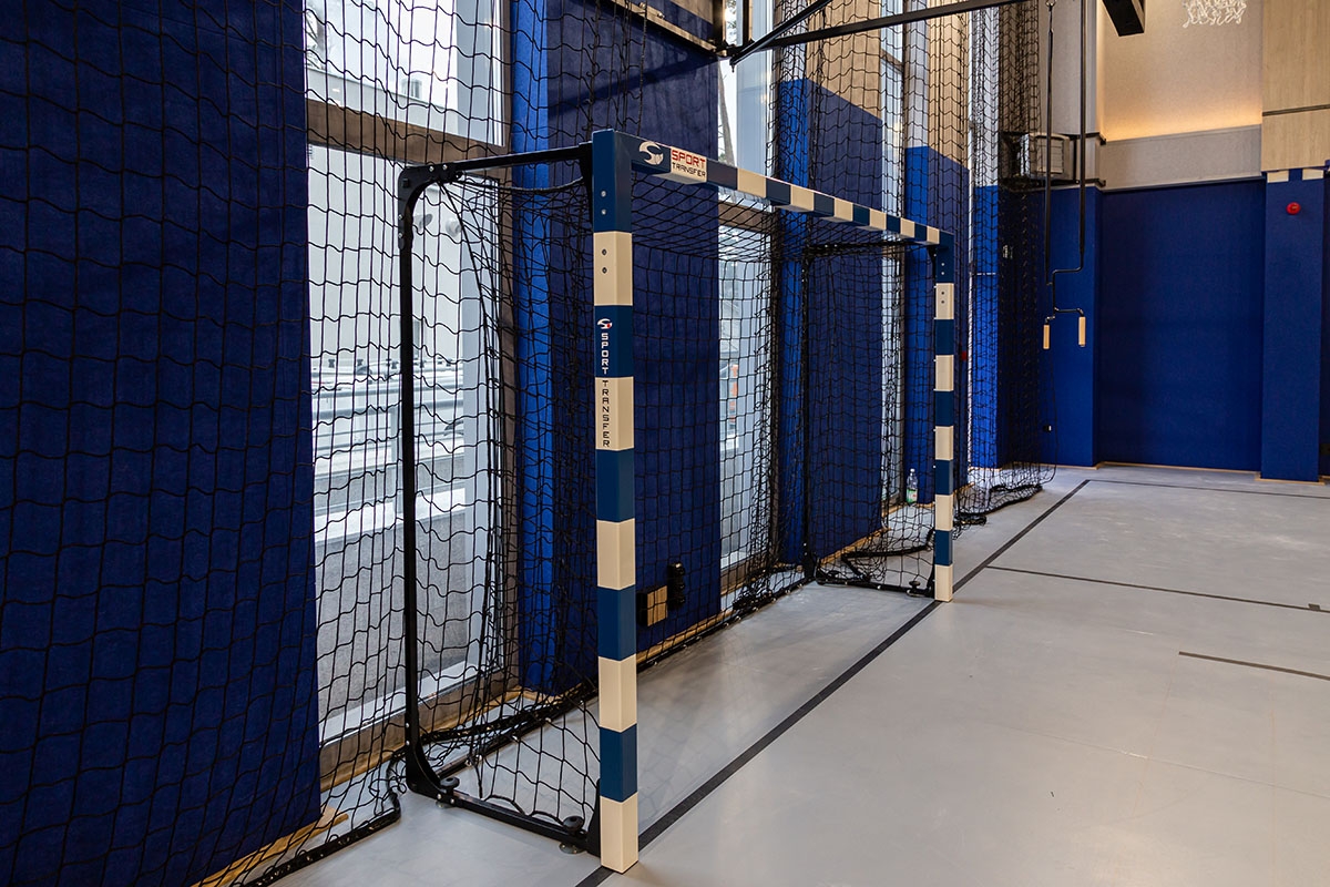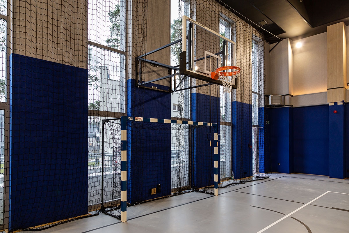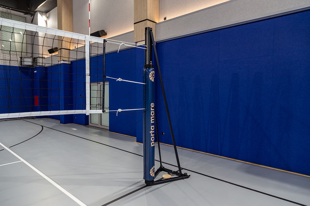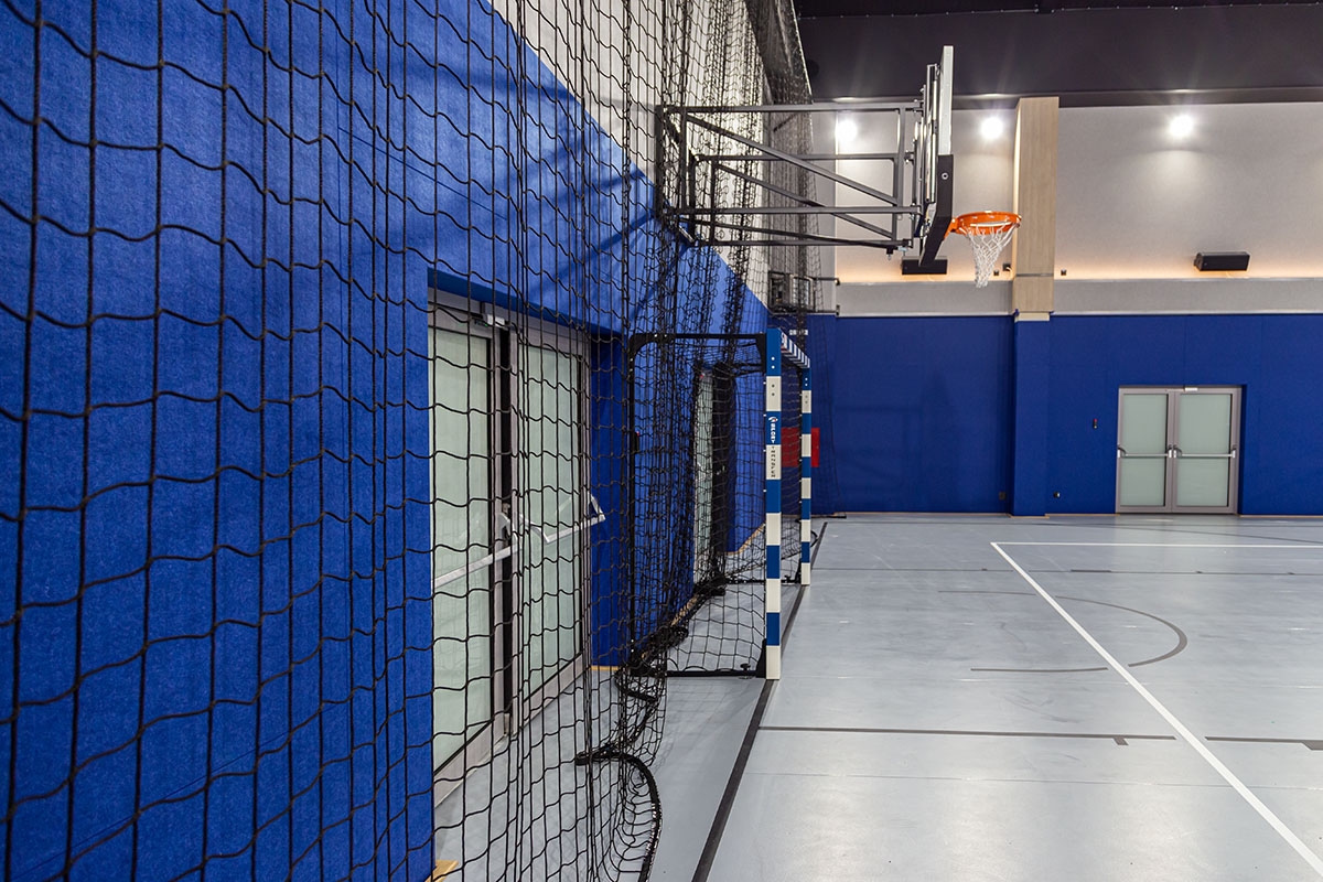 Realizacja obejmowała dostawę oraz montaż konstrukcji do koszykówki składanych na ścianę wraz z tablicami i osłonami, profesjonalnych bramek do piłki ręcznej, piłkochwytów za bramkami, słupków do siatkówki na postawie mocowanej do nawierzchni oraz siatek osłonowych na sufit.