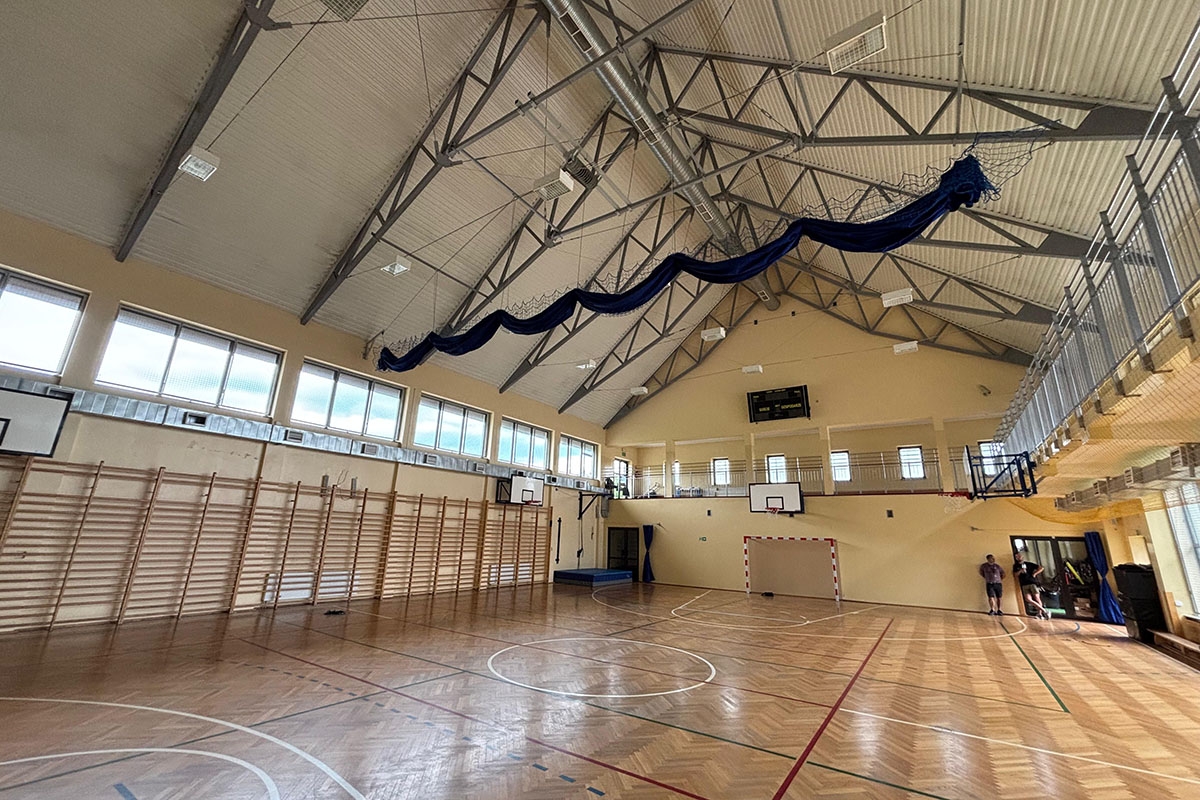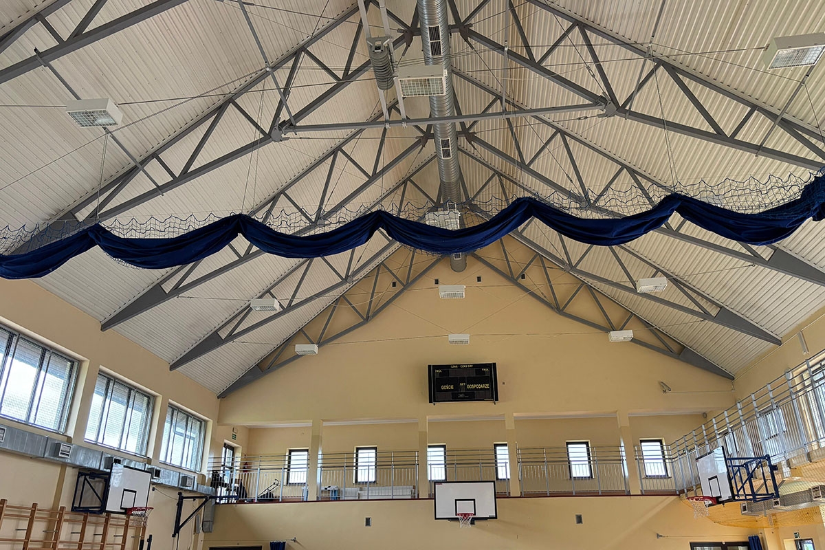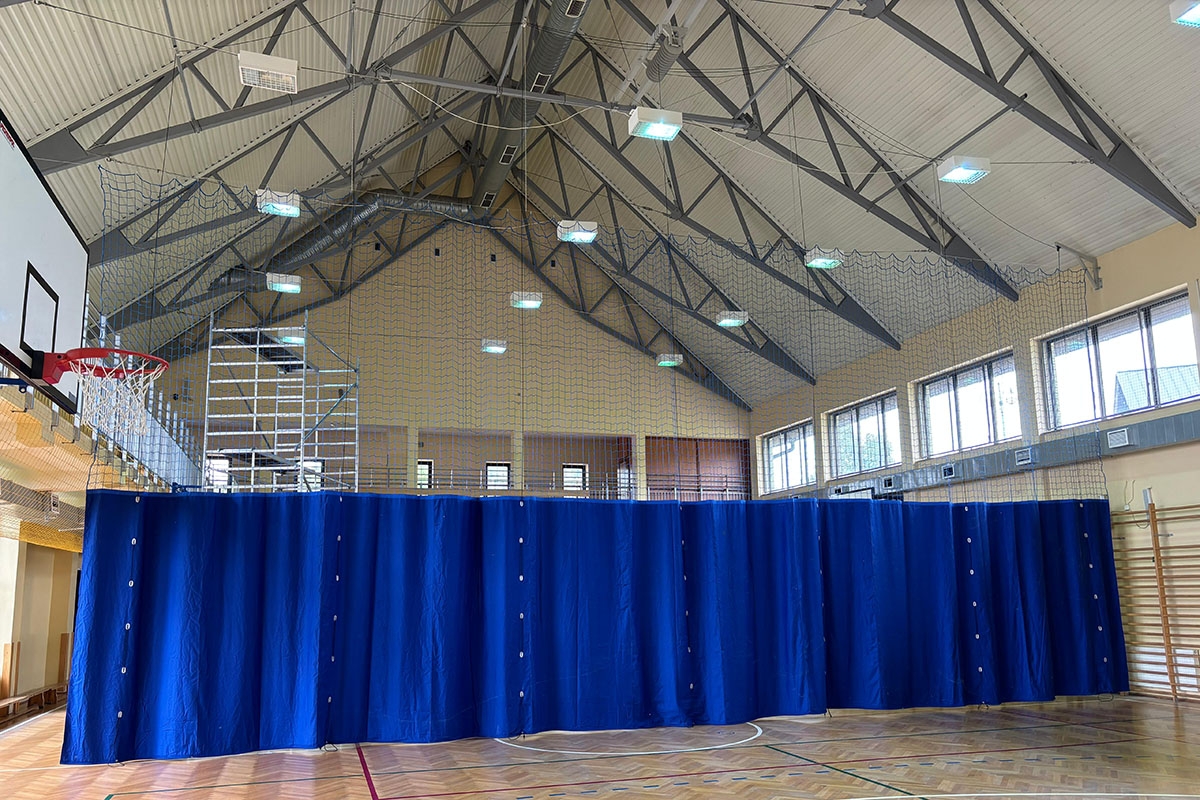 Dostawa oraz montaż konstrukcji kotary podnoszonej pionowo do góry wraz z materiałami nieprzeźroczystym w dolnej części oraz siatką polipropylenową w górnej cześci.